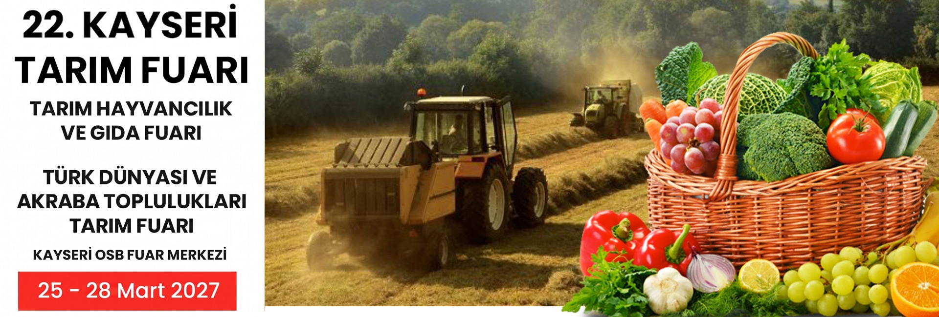 25 - 28 Mart 2027 tarihleri arasında Kayseri OSB Fuar Merkezinde 22. kez düzenlenecek olan Kayseri Tarım, Hayvancılık ve Gıda Fuarı, bu özel yılında 1900 firma ve firma temsilciliğinin katılımıyla 81 ilden gelen yaklaşık 300.000 ziyaretçiyi Kayseri'de buluşturmayı hedeflemektedir. Kayseri Tarım Fuarı, Türk Dünyası ve Akraba Toplulukları Tarım Fuarı ile birlikte gerçekleştirilecektir. Fuar, sektörün önde gelen organizasyonlarından biri olmaya devam edecektir.